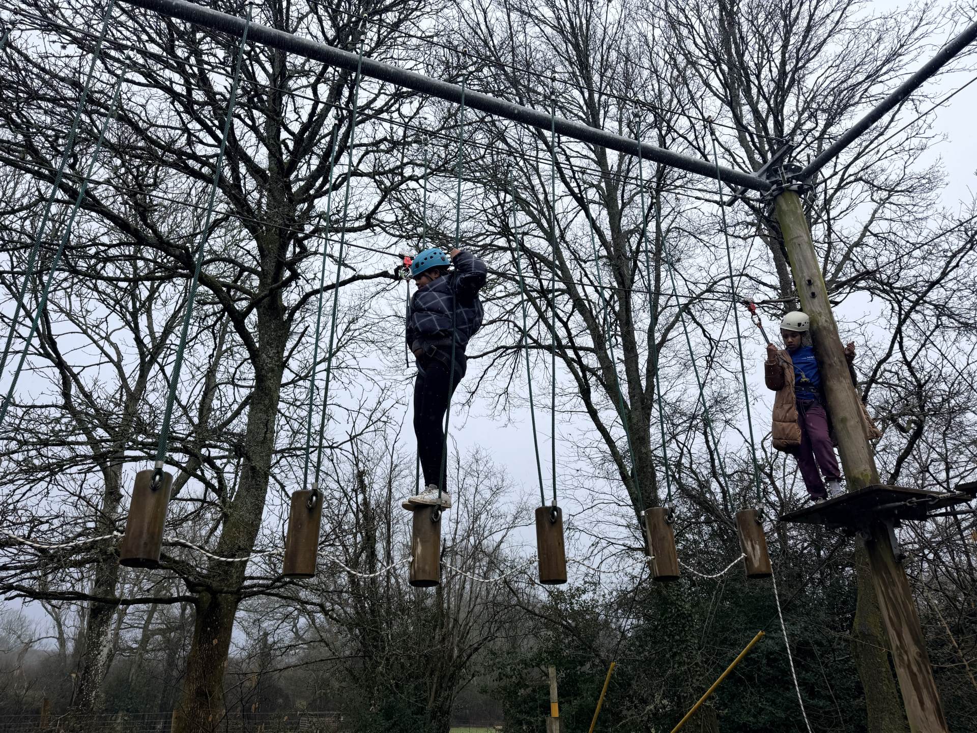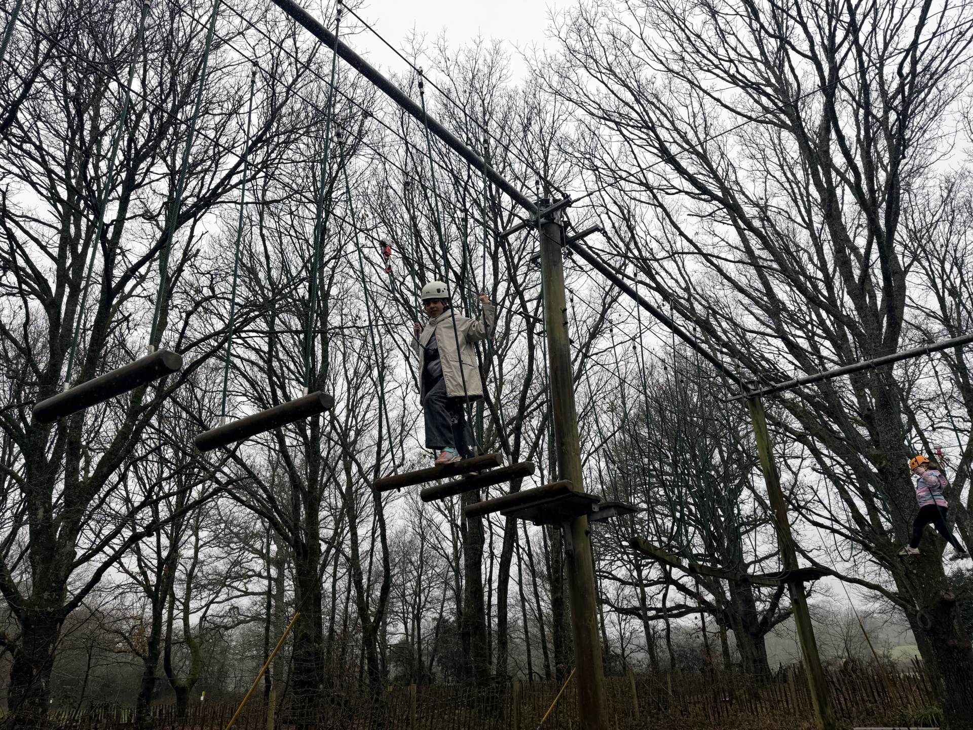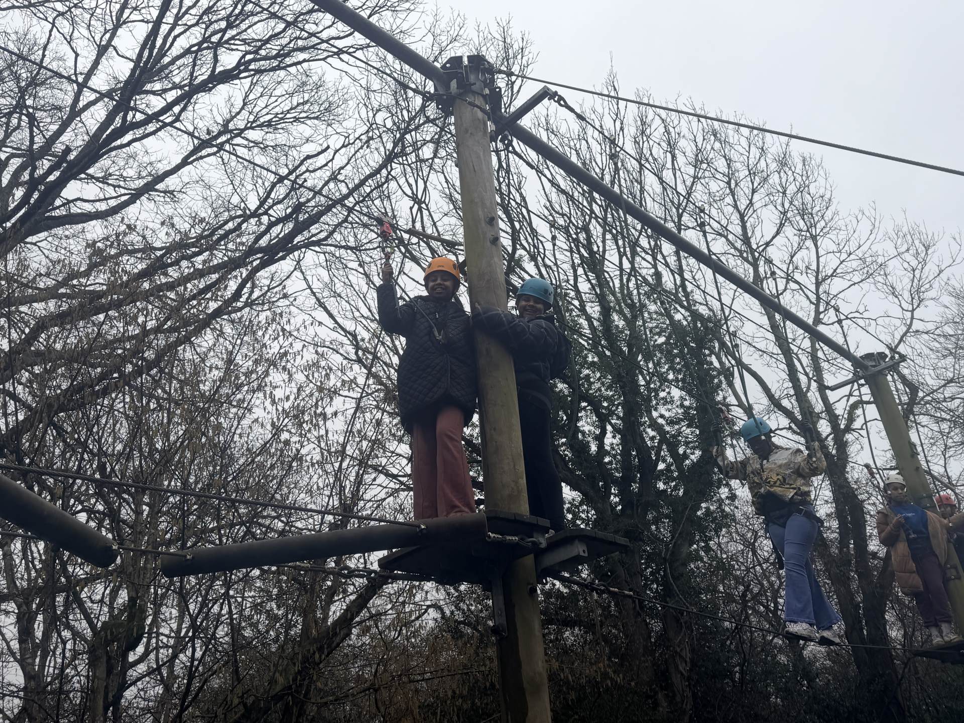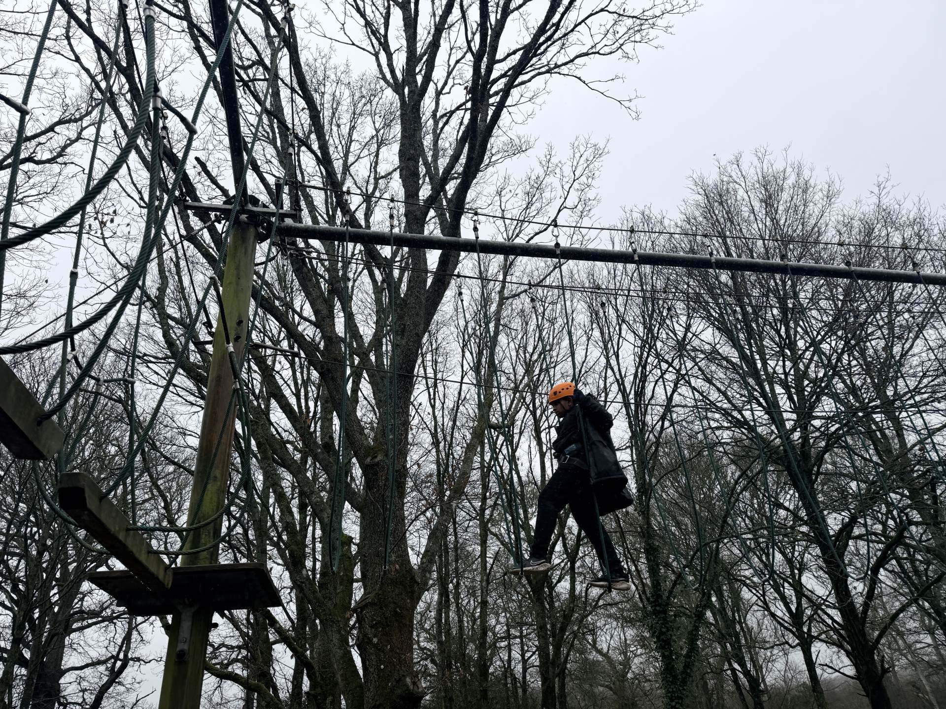 Then on to the most heart-racing event we've had so far- THE HIGH ROPES! We put on harnesses and helmets and settled in for the safety talk before we tackled the complex course. We had to push past our fears to complete the course in very tricky rainy conditions. The final step was a zip wire through the air into the end zone- we were like superheroes on the final run!