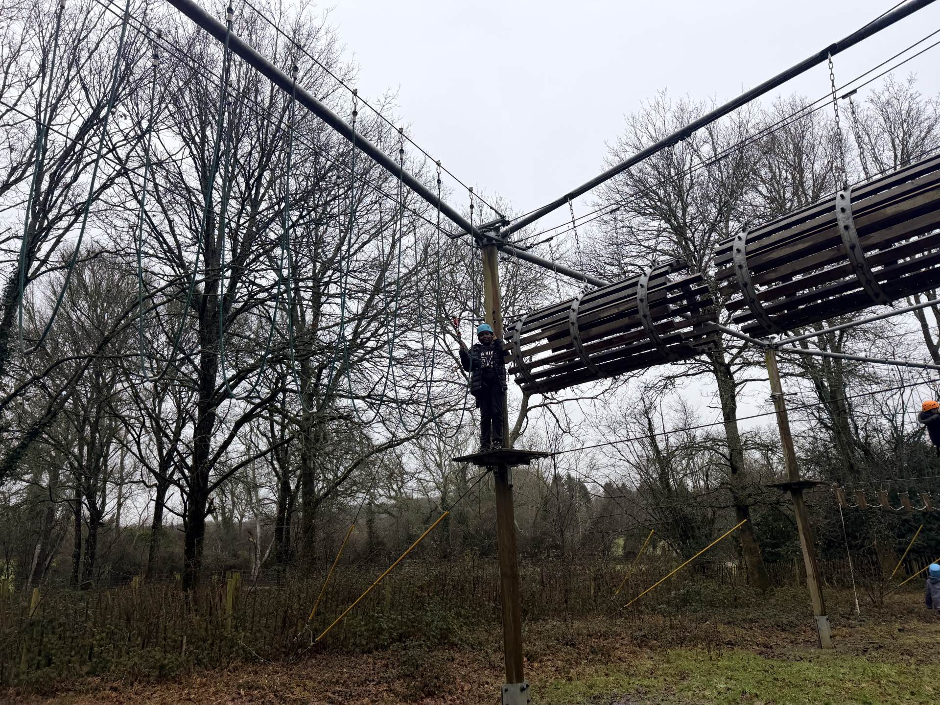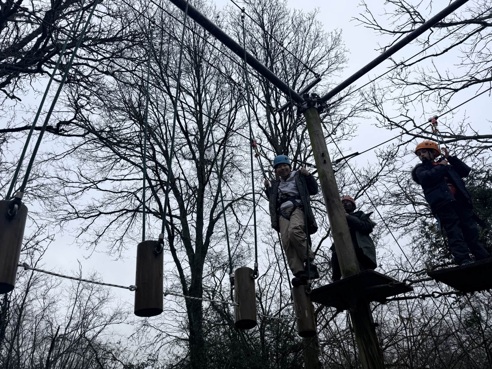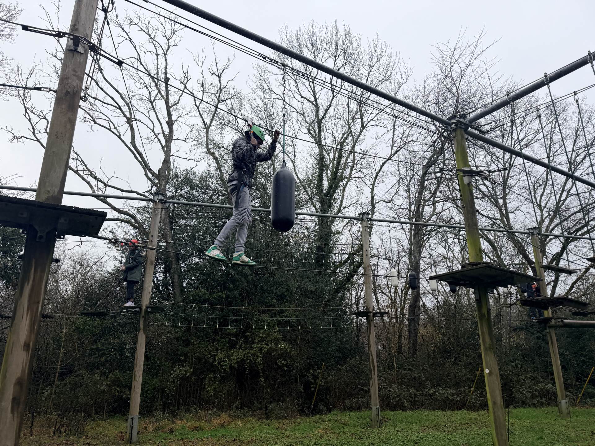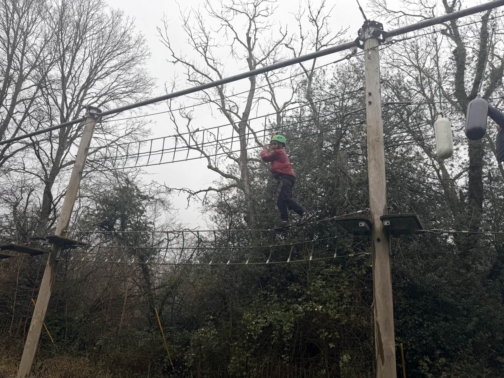 Then on to the most heart-racing event we've had so far- THE HIGH ROPES! We put on harnesses and helmets and settled in for the safety talk before we tackled the complex course. We had to push past our fears to complete the course in very tricky rainy conditions. The final step was a zip wire through the air into the end zone- we were like superheroes on the final run!