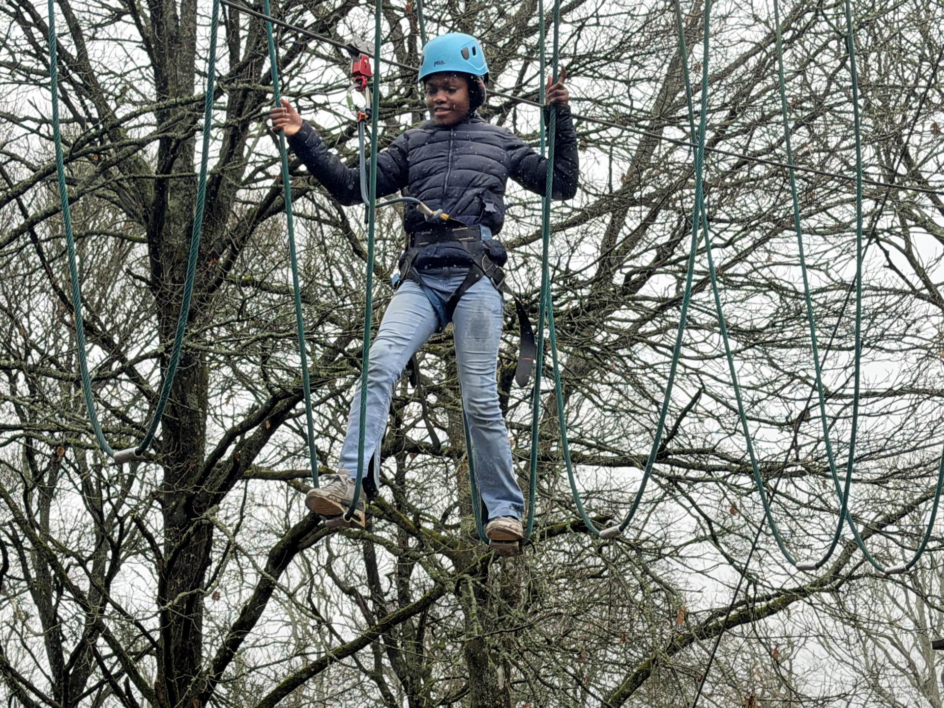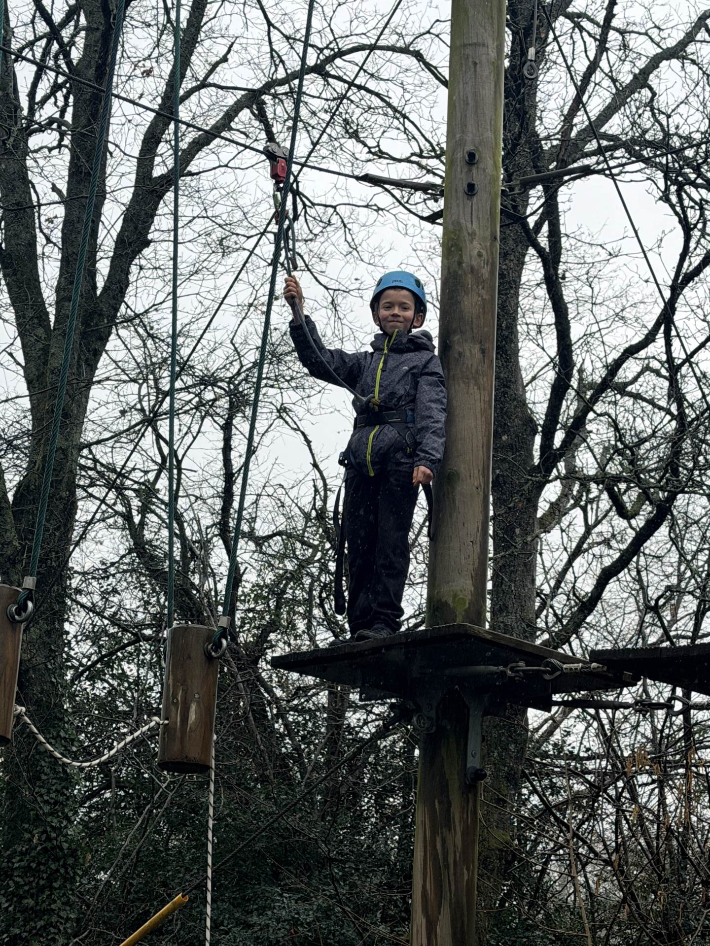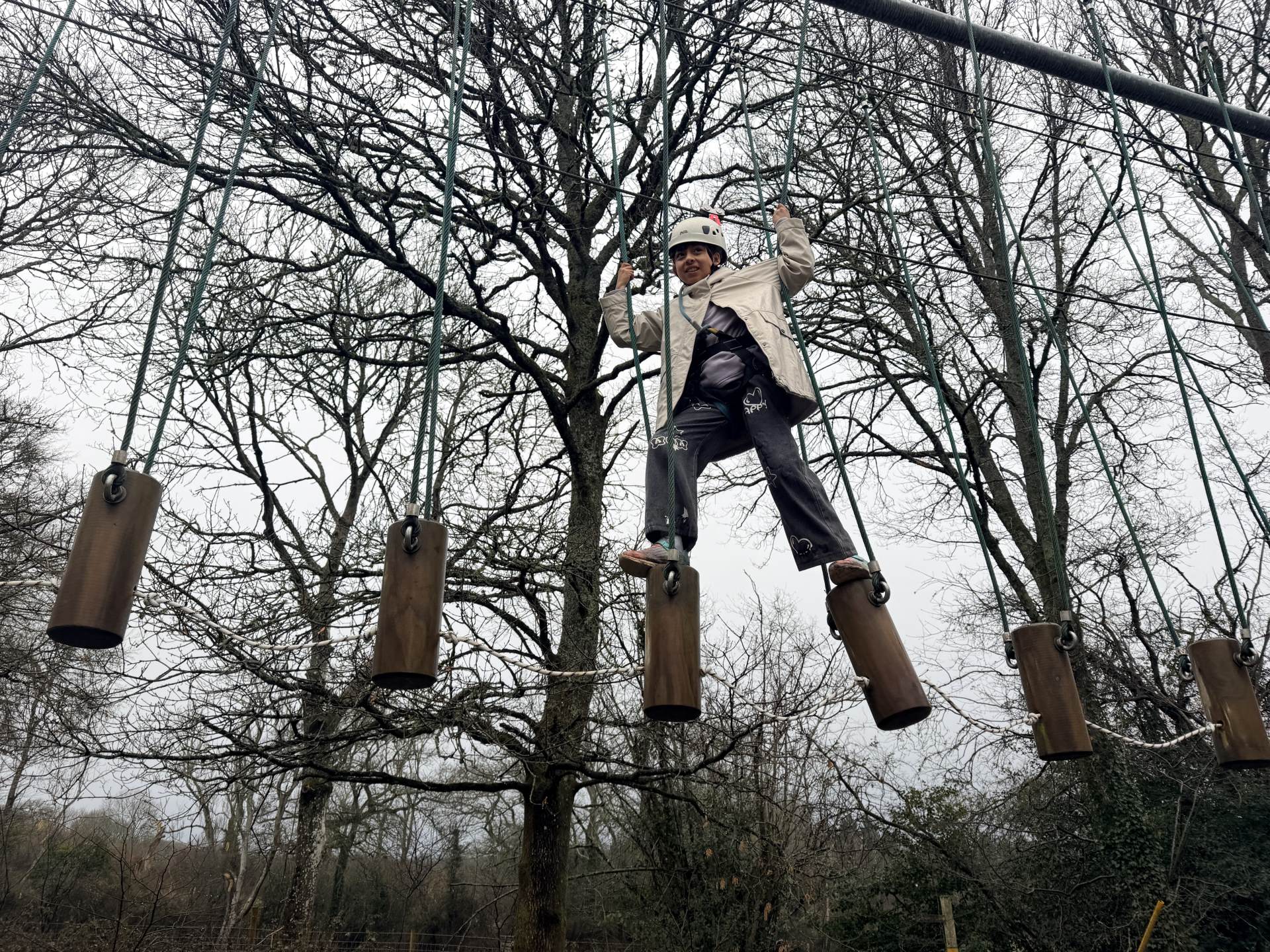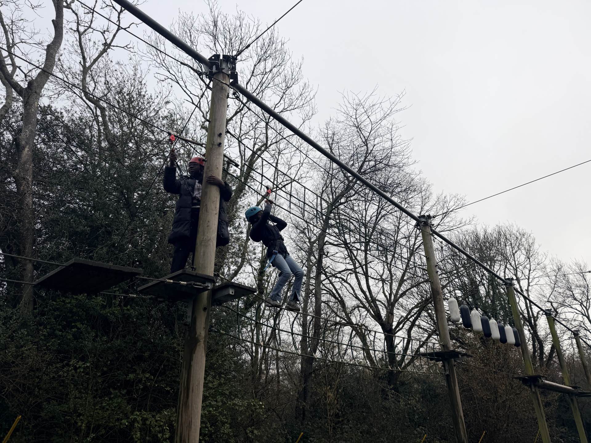 Then on to the most heart-racing event we've had so far- THE HIGH ROPES! We put on harnesses and helmets and settled in for the safety talk before we tackled the complex course. We had to push past our fears to complete the course in very tricky rainy conditions. The final step was a zip wire through the air into the end zone- we were like superheroes on the final run!